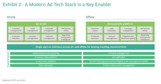 Tech. Retailers should not underestimate the mechanics of delivering ads. They will need to build or access a sophisticated advertising tech stack that can deliver both onsite and offsite outreach across multiple locations and channels (see Exhibit 2.)