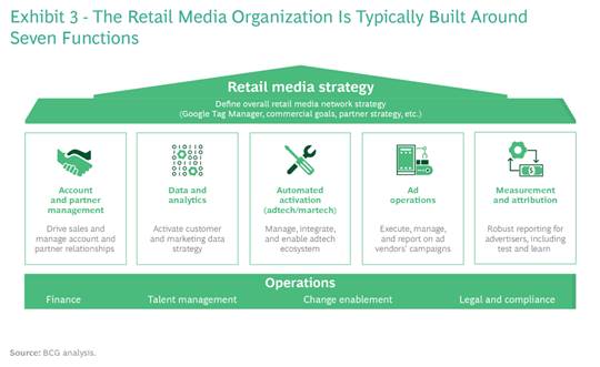 For all but the most advanced retailers, the media business will require the acquisition of new skill sets—such as sales teams that can sell media and tech experts who can set up an ad ops team—since advertisers will expect the same level of capability, professionalism, and performance that they receive from digital publishers and tech giants. Generally this requires establishing an independent retail media group organized around seven functions (see Exhibit 3.) And if retailers don’t align merchant incentives with the new group, they will experience substantial resistance to change, pitting the internal “startup” against the existing organization.